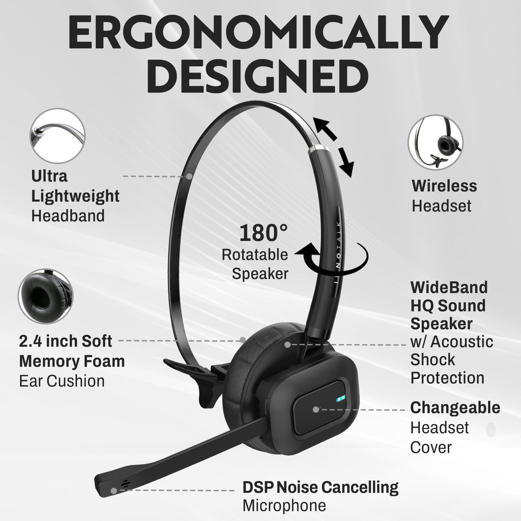 The Pioneer U version provides wireless Unified communication that enable your computer and desk phone to link both and easily switches call connectivity between office phones and computer. The amazing Pioneer wireless headset allows you to roam your office while you talk with up to 300 feet of range to roam your office. You'll improve productivity as you're able to gather information throughout your office while continuing to talk. The INNOTALK Pioneer wireless headset provides convertible choice of a headband and ear loops for those who prefer to wear it around the ear in black or wine color. With two wearing styles included, you decide what's best for your all-day wearing comfort. Using the over-the-ear application, the INNOTALK Pioneer only weighs 0.7 oz, the super light headset in the commercial grade industry. Opting for the headband will provide a secure fit with a soft ear cushion sealing out sound from your environment, giving you a clear and crisp conversation with your caller. In addition it gives you 8 hours of talk time to get you through a busy day. Placing it on the charging base while you are at lunch, or its not in use, helps to extend the talk time. The newest DECT Technology helps eliminate Wi-Fi interference, and allows you to have up to 38 units in one area before you start diminishing your range. If you need to have other colleagues shared a base with you, you can set three headsets on a same base. Also you have volume and mute controls on the earpiece, so no matter where you are you can adjust the volume accordingly. This headset is equipped with all the technology of today, and more serious about getting more done in a busy work day.