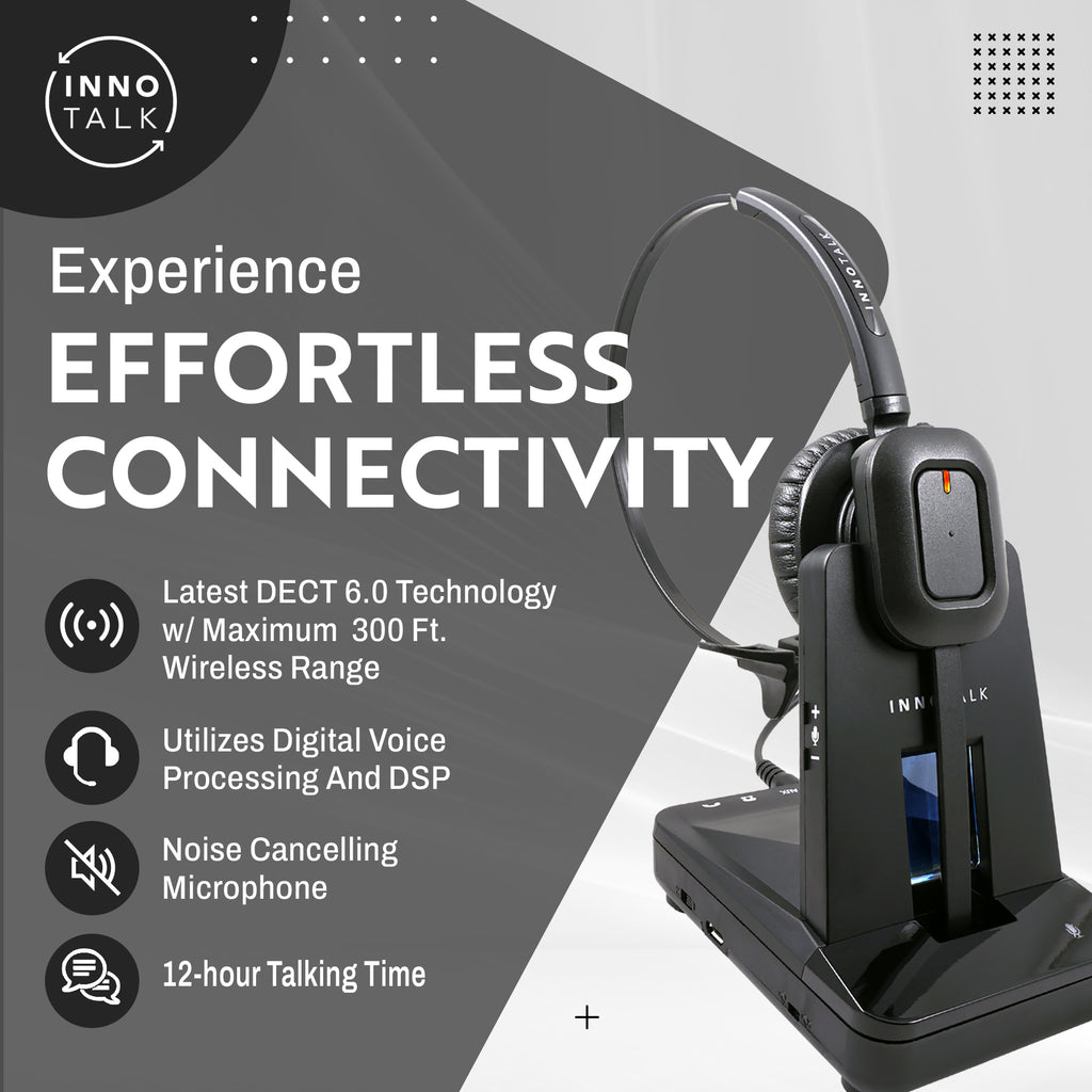 The amazing INNOTALK wireless headset allows you to roam your office while you talk with up to 300 feet of range to roam your office. You'll improve productivity as you're able to gather information throughout your office while continuing to talk. It provides a convertible choice of a headband and ear loops for those who prefer to wear it around the ear in black or wine color. With two wearing styles included, you decide what's best for your all-day wearing comfort. Using the over-the-ear application, the INNOTALK only weighs 0.7 oz, the super light headset in the commercial grade industry. Opting for the headband will provide a secure fit with a soft ear cushion sealing out sound from your environment, giving you a clear and crisp conversation with your caller. In addition it gives you 12 hours of talk time to get you through a busy day. Placing it on the charging base while you are at lunch, or if it's not in use, helps to extend the talk time. The newest DECT Technology helps eliminate Wi-Fi interference, and allows you to have up to 38 units in one area before you start diminishing your range. Also you have volume and mute controls on the earpiece, so no matter where you are you can adjust the volume accordingly. This headset is equipped with all the technology of today, and more serious about getting more done in a busy work day.